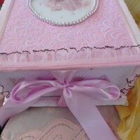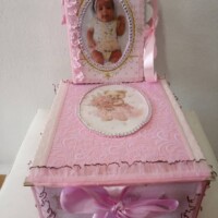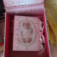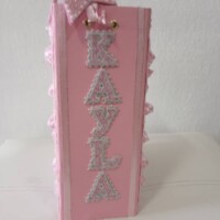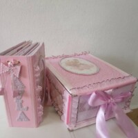 🌸 Álbum mediano con caja decorativa en rosa claro, con el nombre de la bebé en la portada.