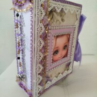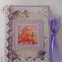Por fuera, luce como una obra artesanal: puntas tejidas alrededor de todo el álbum, abrazando con delicadeza cada borde. En la portada, la foto del bebé se guarda protegida bajo mica, enmarcada con piedras brillantes que hacen resaltar aún más la imagen principal ✨. El lomo lleva grabado el nombre y un dije decorativo, que añade un toque elegante y personal.