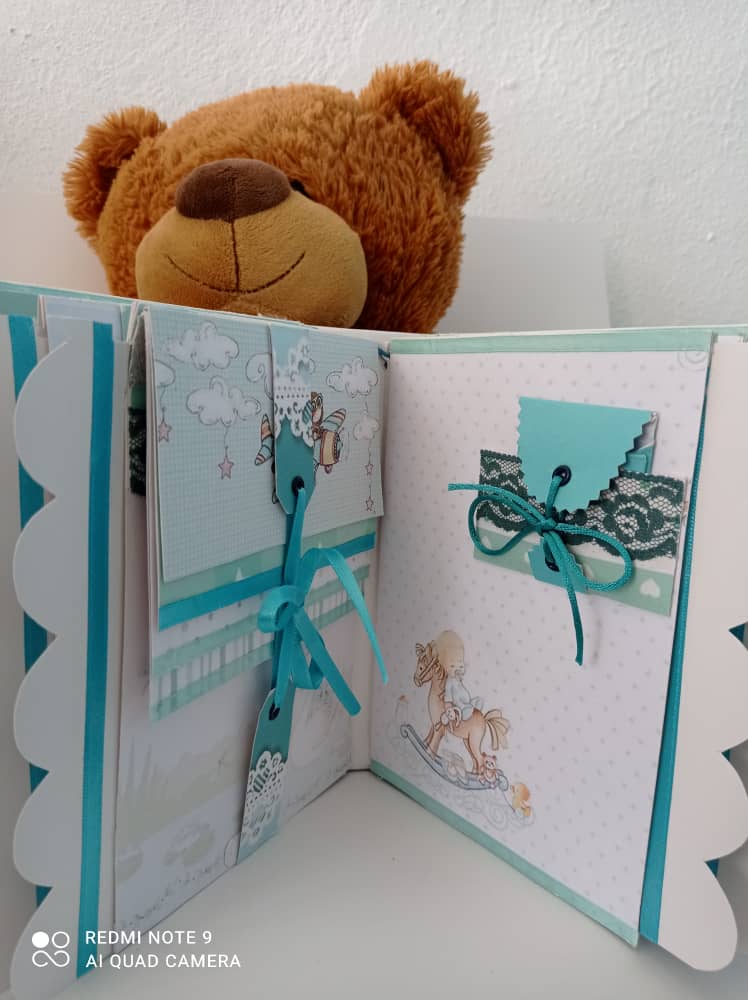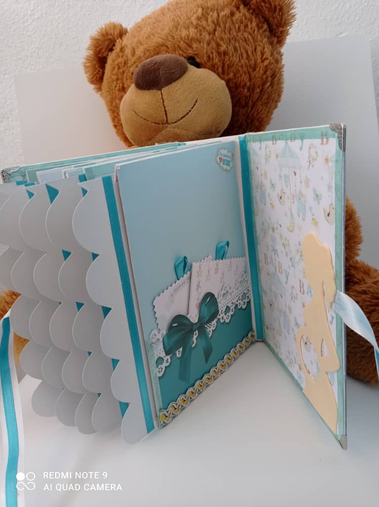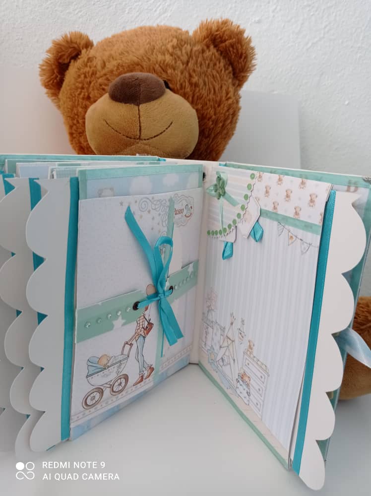 En un rincón sereno, nació este álbum mediano, decorado con tonos suaves de blanco y verde agua, como si cada página estuviera bañada por la luz de un riachuelo tranquilo. Sus hojas abiertas parecen olas que guardan secretos y primeras sonrisas.