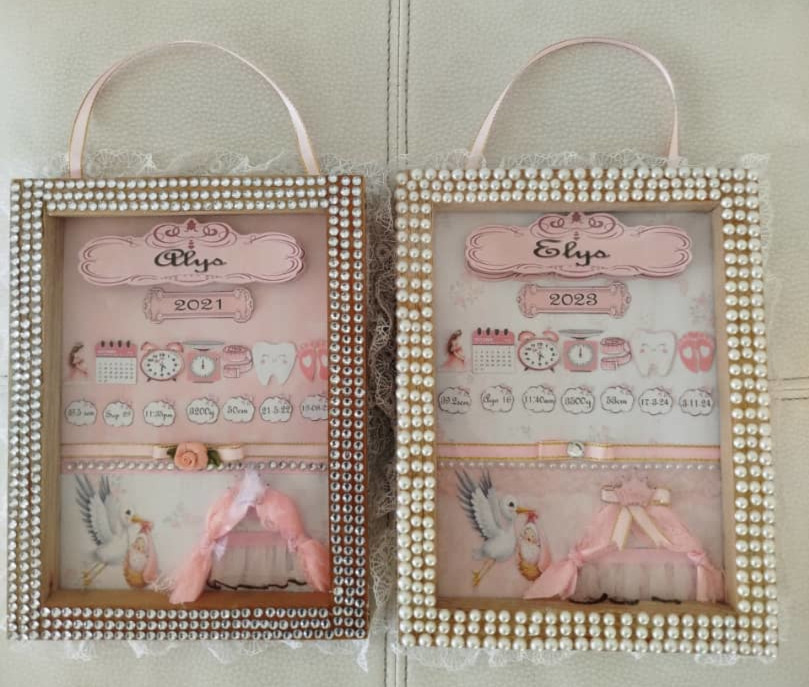 Su diseño combina la ternura con la elegancia: un marco de madera con mica protectora, que puede resguardar no solo las palabras, sino también una fotografía especial o un pequeño muñeco decorativo. En el centro, brilla con protagonismo el nombre del bebé, como un título que anuncia el comienzo de su propia historia.