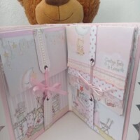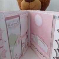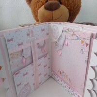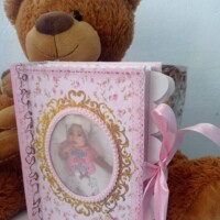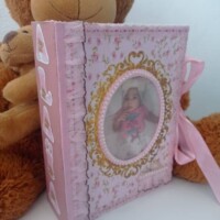 Por fuera, un marco adornado con perlas abraza la foto del bebé, enmarcada con brillo y gracia. Vuelitos rosados y destellos perlados recorren el interior como si fueran pequeños suspiros convertidos en encaje. En su lomo, un espacio especial guarda el nombre del pequeño protagonista, mientras un dije decorativo cuelga como amuleto de amor.