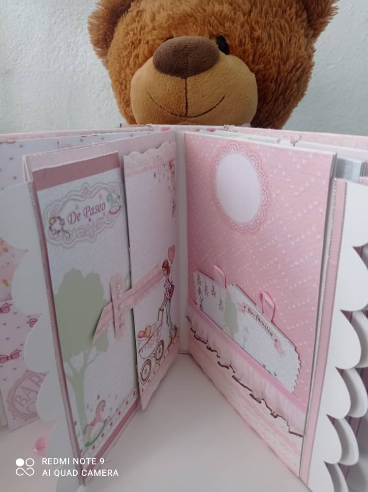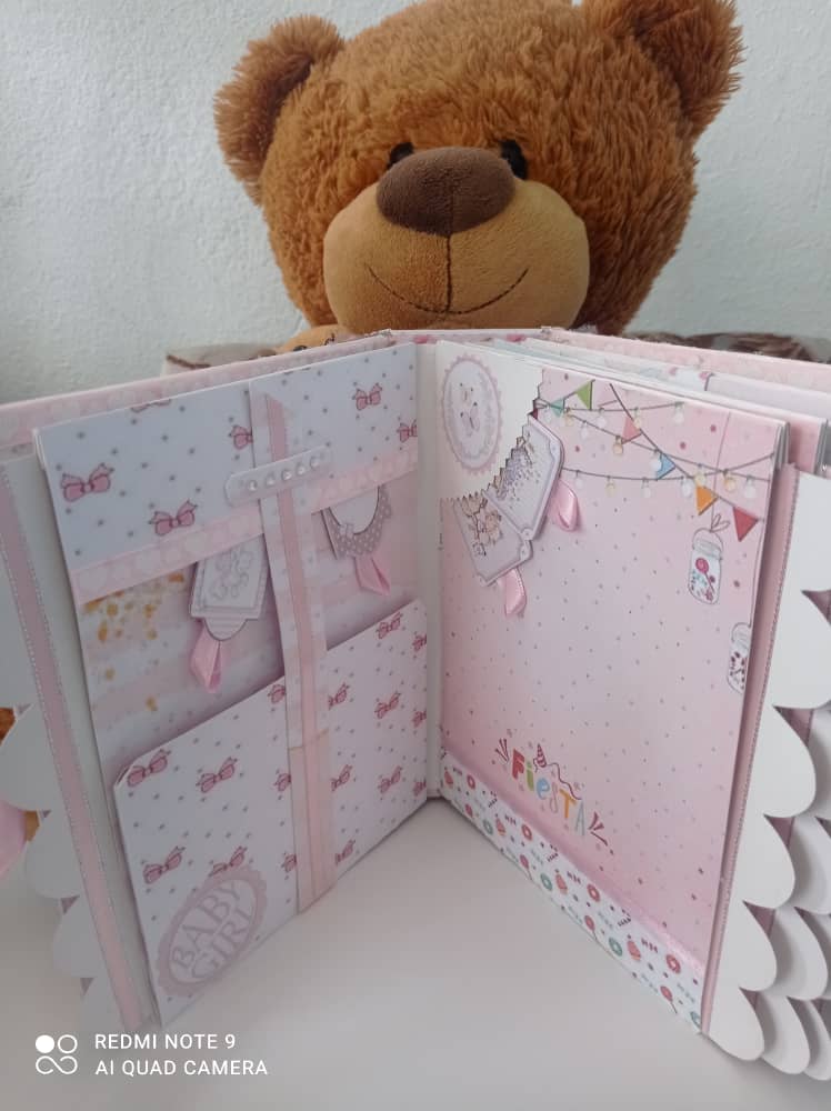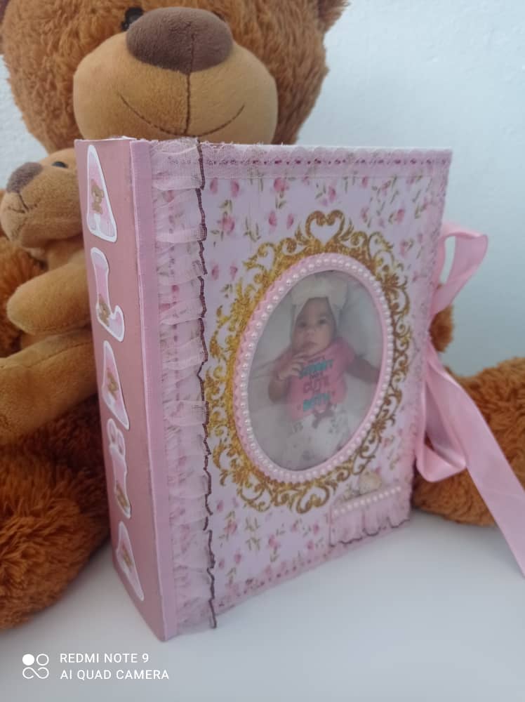 Decoración: perlas en portada y bordes, marco con perlas y fuami, vuelitos rosados, dije decorativo, cierre con cinta satinada de 4 cm.