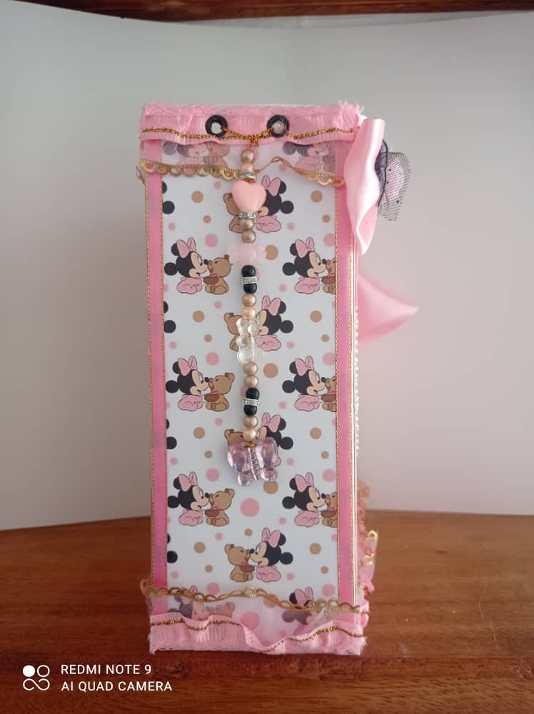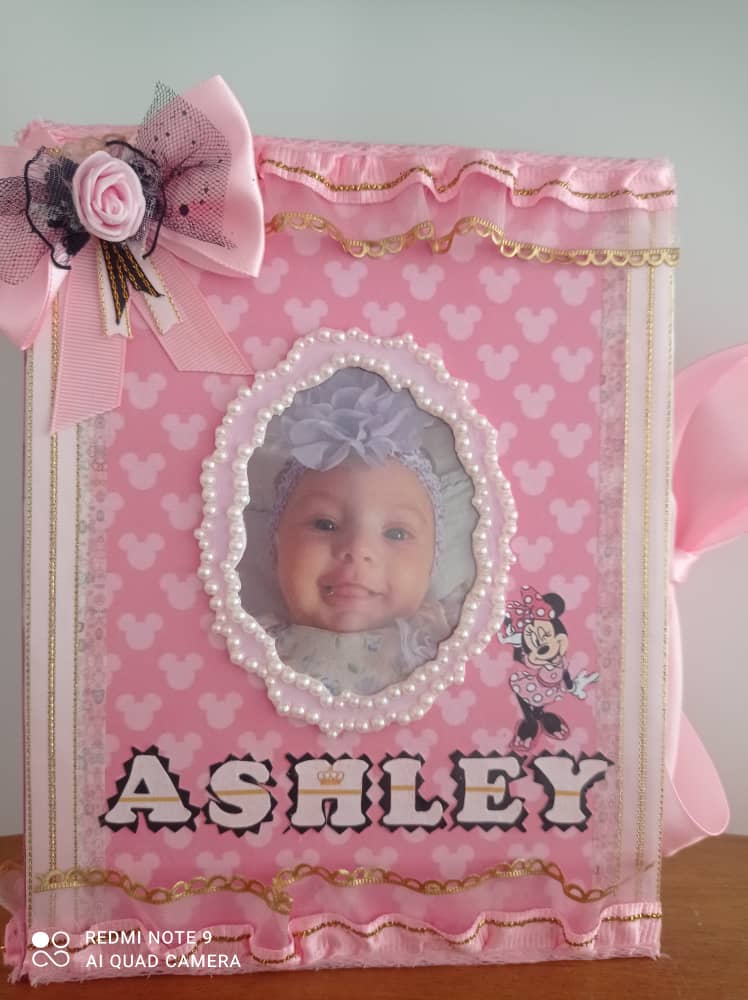 Foto de portada: Ovalada, fija con mica, marco con perlas, decorada con un lazo rosado y negro en la esquina superior izquierda