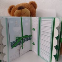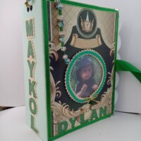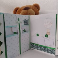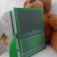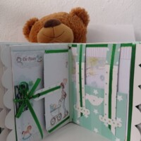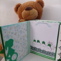 En un bosque de tonalidades verdes nació este álbum mediano, pensado para guardar con cariño los primeros momentos de la vida. Sus páginas interiores, adornadas con cintas satinadas verdes con bordes dorados, parecen hojas que guardan secretos y sonrisas diminutas.