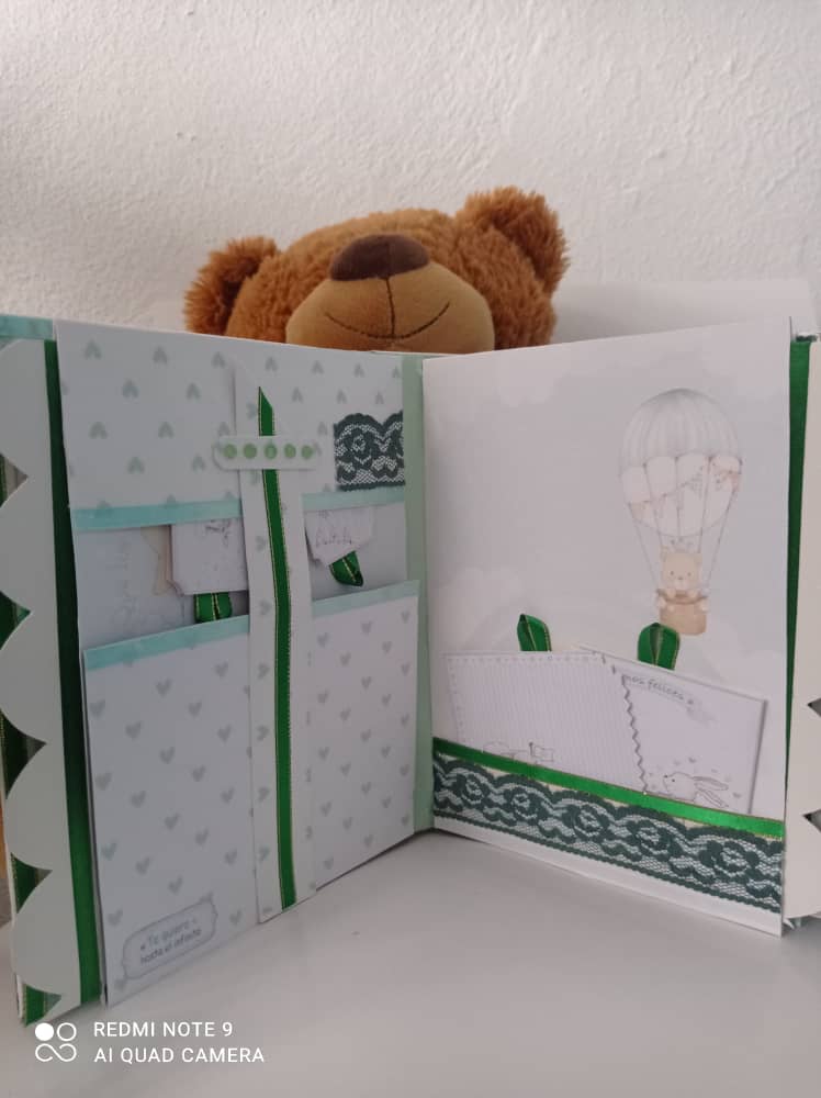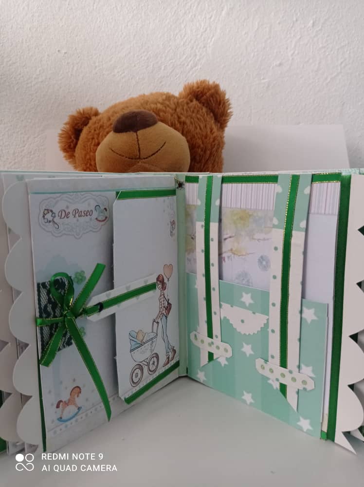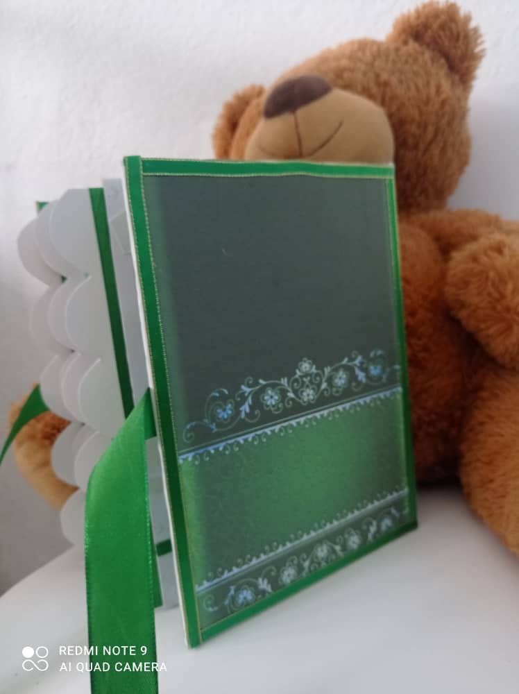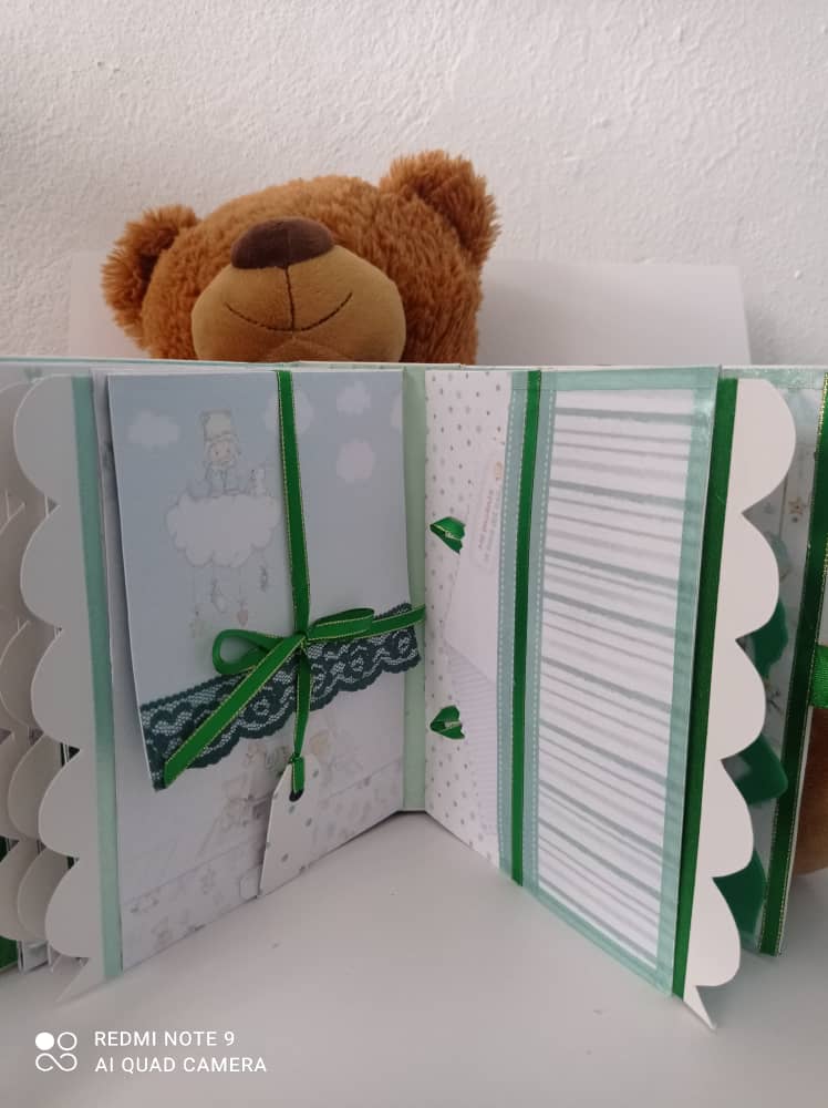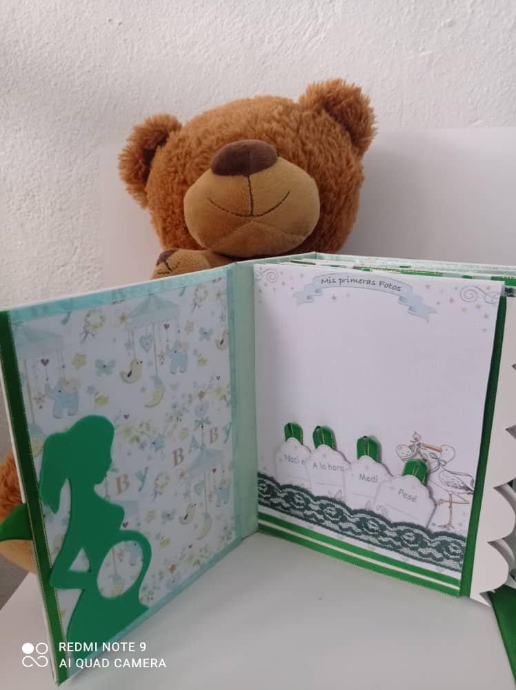 En un bosque de tonalidades verdes nació este álbum mediano, pensado para guardar con cariño los primeros momentos de la vida. Sus páginas interiores, adornadas con cintas satinadas verdes con bordes dorados, parecen hojas que guardan secretos y sonrisas diminutas.