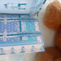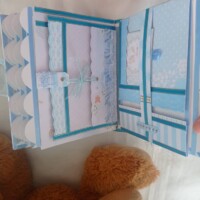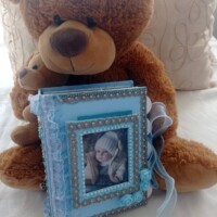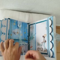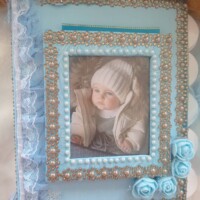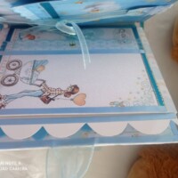 Por fuera, el álbum luce un azul cielo acariciado con destellos de “caramelito”: un delicado marco de piedrecitas que rodean la foto principal, protegida por mica, y que brillan en distintas medidas como si fueran estrellas en un cielo azucarado ✨. El lomo guarda un dije decorativo que le da el toque elegante y especial.