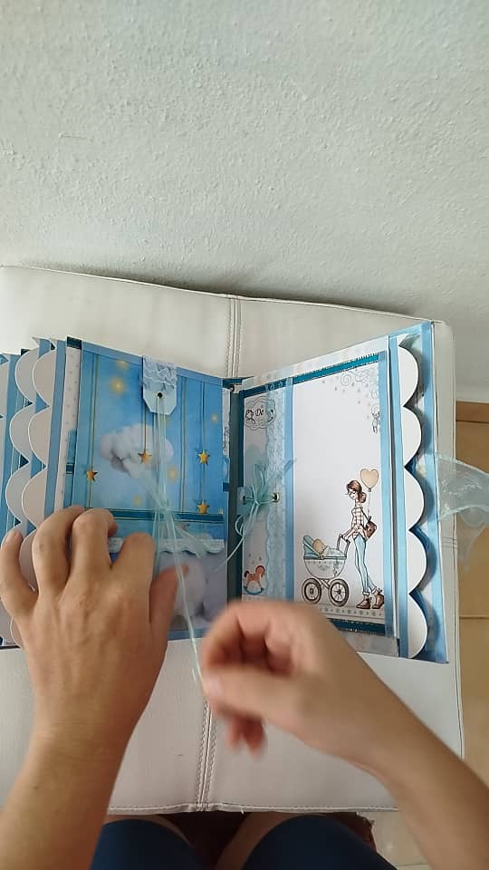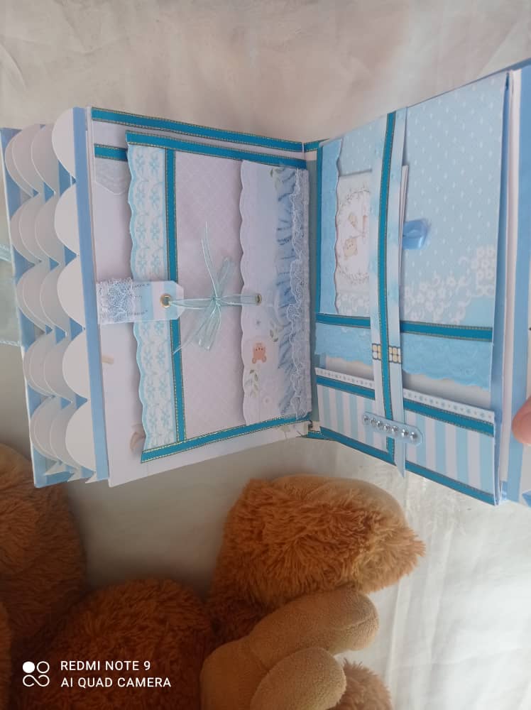 Además, incluye postales internas para decorar con ternura cada etapa y postales laterales grandes con conchitas marinas, donde se pueden poner las fotos mes a mes, desde el primer mes hasta cumplir un año 🌊🐚.