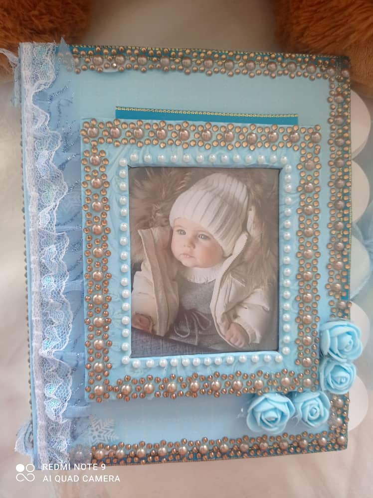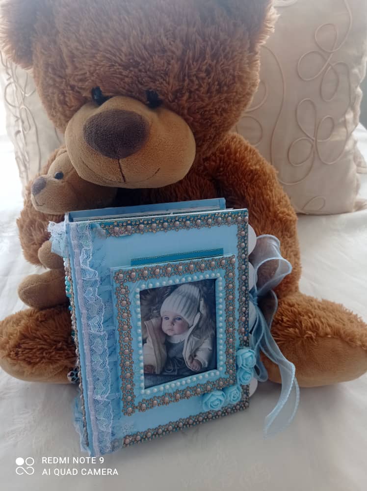 Por fuera, el álbum luce un azul cielo acariciado con destellos de “caramelito”: un delicado marco de piedrecitas que rodean la foto principal, protegida por mica, y que brillan en distintas medidas como si fueran estrellas en un cielo azucarado ✨. El lomo guarda un dije decorativo que le da el toque elegante y especial.