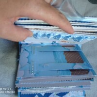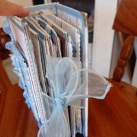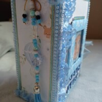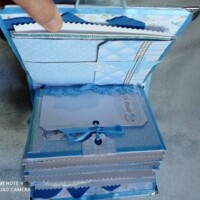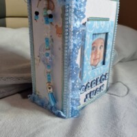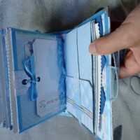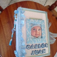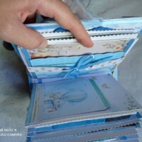 Tonalidades azul pastel, con bolitas decorativas que parecen pequeñas nubes jugando alrededor del álbum.