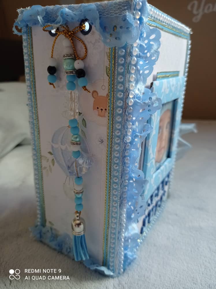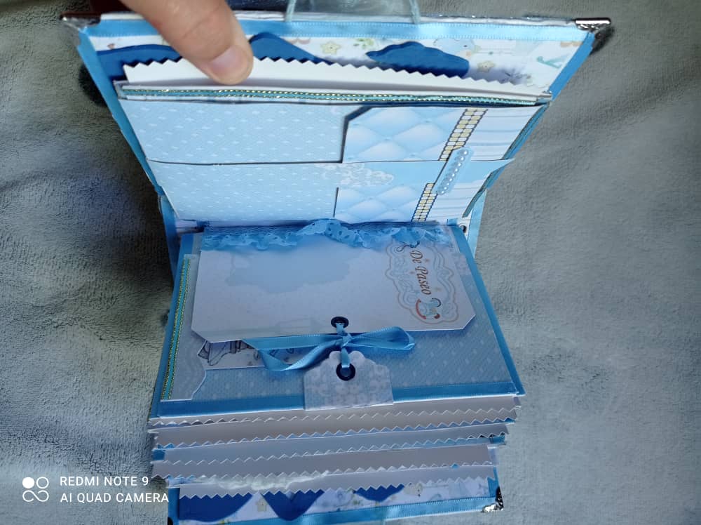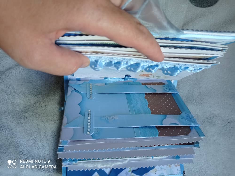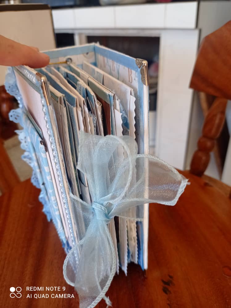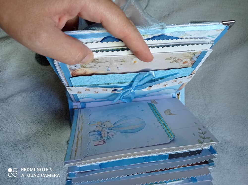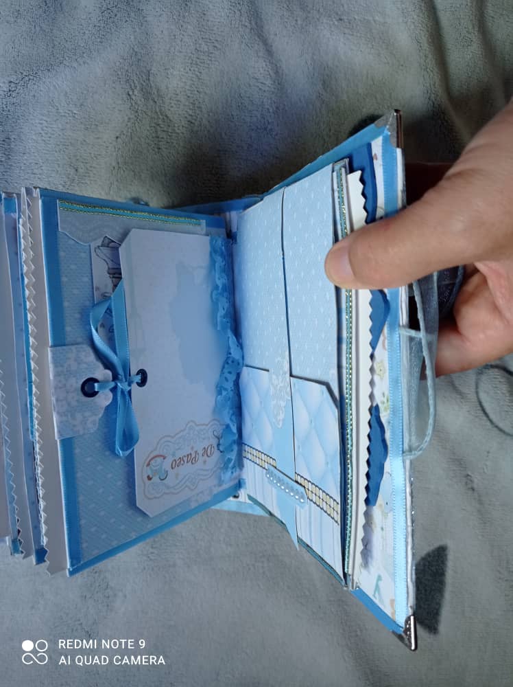 Tonalidades azul pastel, con bolitas decorativas que parecen pequeñas nubes jugando alrededor del álbum.