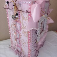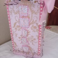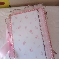 Portada decorada con perlas, muchos vuelitos y un marco elegante, con flores de fuami en las esquinas y encaje rosado.