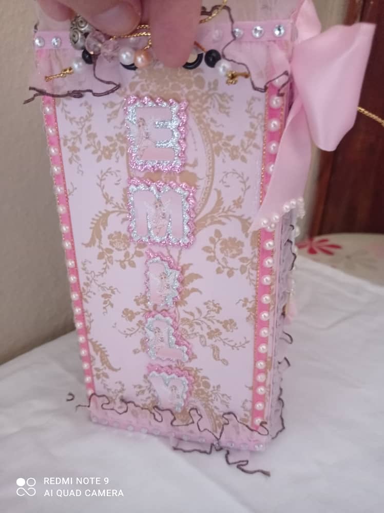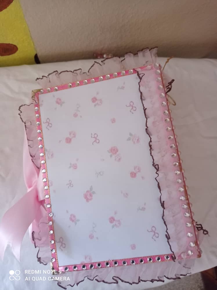 Portada decorada con perlas, muchos vuelitos y un marco elegante, con flores de fuami en las esquinas y encaje rosado.