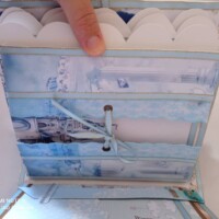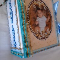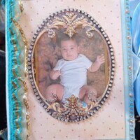 Portada en forma ovalada tipo marco, adornada con perlas alrededor que enmarcan la foto del bebé.