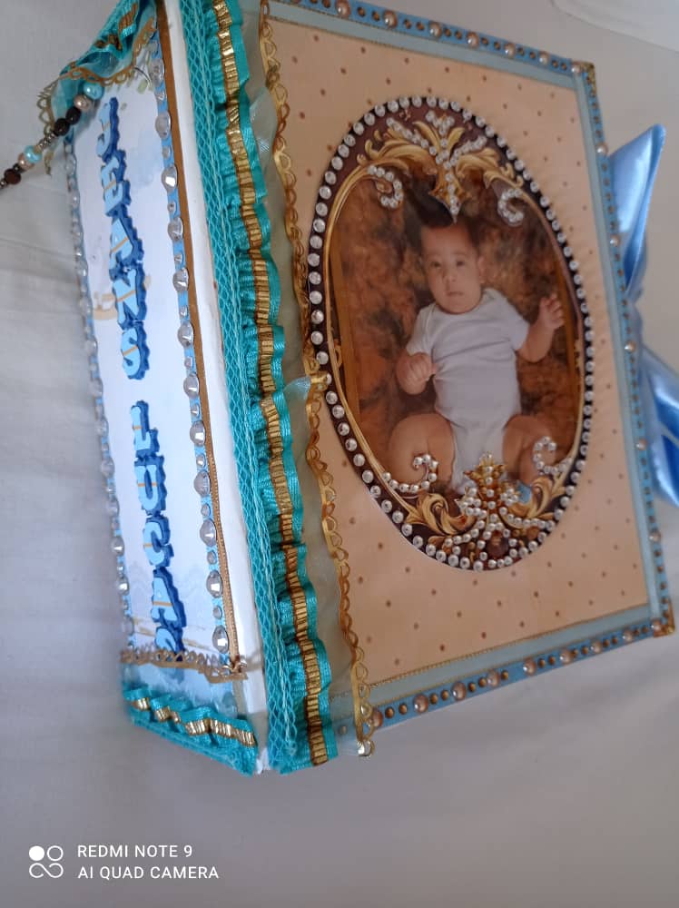 En el lomo se graba el nombre del bebé, acompañado de un dije decorativo.